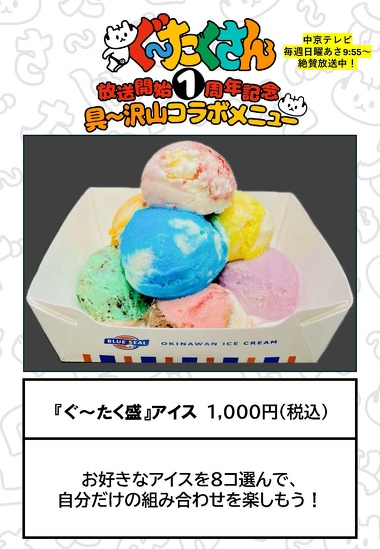 中京テレビ『ぐ~たくさん』一周年記念コラボ企画で当店のブルーシール店が生出演しました!! 『ブルーシール事業部配信』 名古屋で人気のTV番組『ぐ~たくさん』一周年記念企画として、コラボメニューを作っちゃいました! スタジオ生出演にお呼ばれして出演者の方々へその場でスクープして提供させて頂きました! なかなか貴重な体験でした! 名古屋駅エスカ店とのコラボメニュー! 控室前で記念撮影! 一覧へ戻る